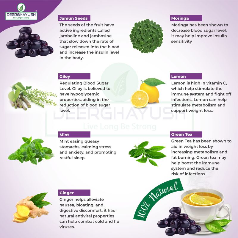 How is it different from regular green tea? | DEERGHAYUSH is a herbal blend with ingredients like Jamun, Giloy, Moringa, Mint, Lemon, and Ginger – offering health benefits beyond regular green tea. |